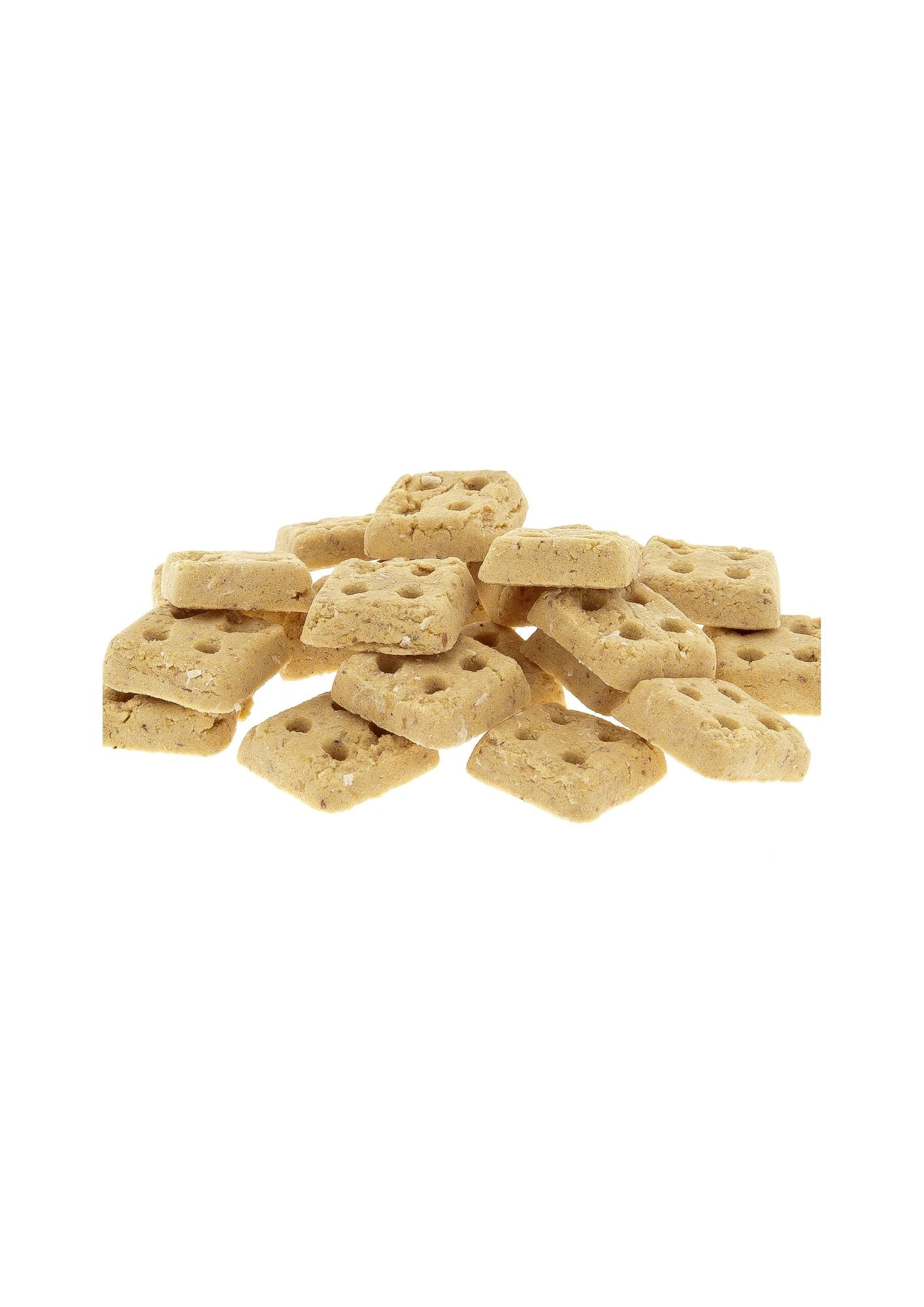 Questi biscotti quadrati (2,2x2,2 cm) sono realizzati con ingredienti genuini, ideali per coccolare il tuo cane con uno snack sano, gustoso e ricco di proprietà benefiche.
