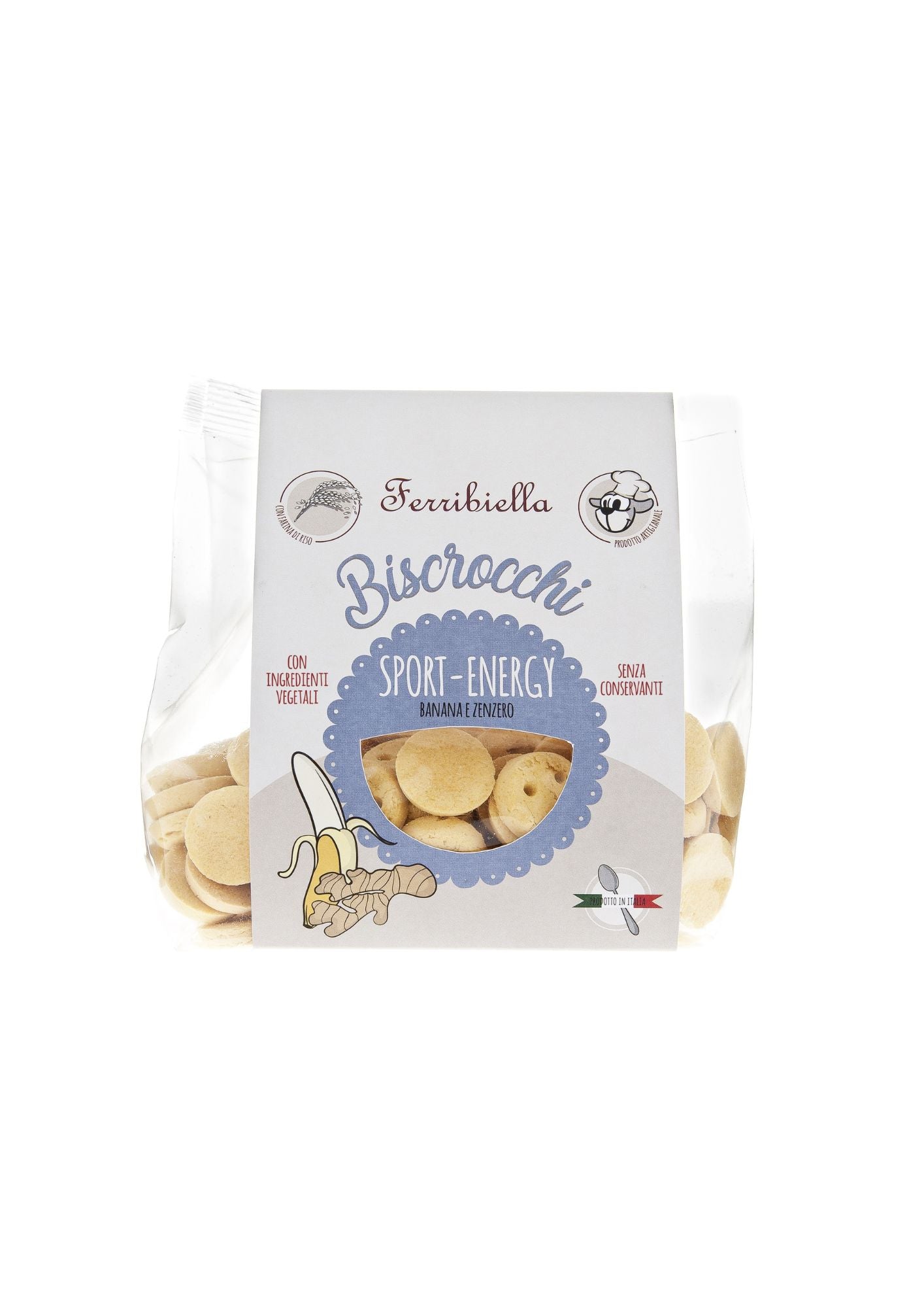 Farina di mais, farina di grano tenero 00, farina di riso, strutto, farina di mandorle, sale, polpa di banana in polvere, zenzero in polvere.