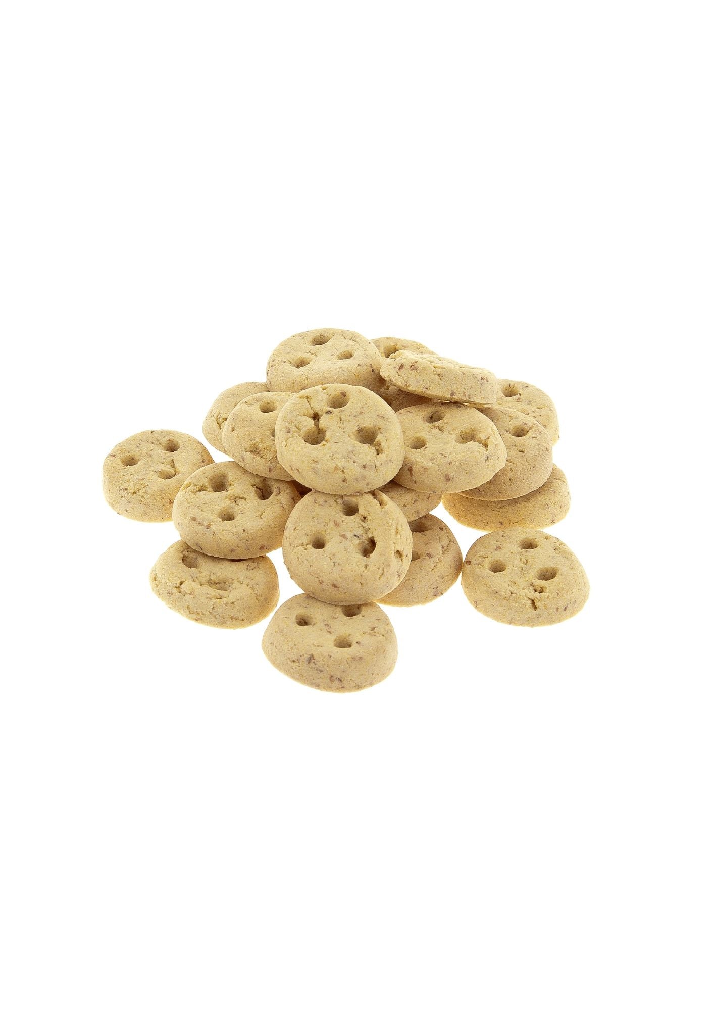 Questi biscotti rotondi (2,5x2,5 cm) sono realizzati con ingredienti genuini e nutrienti, pensati per offrire gusto, energia e benessere in ogni snack.
