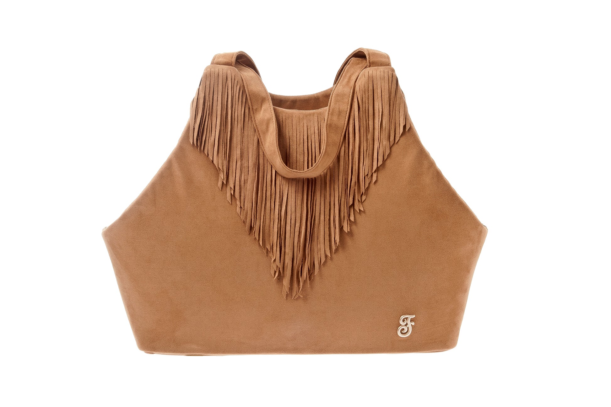 Realizzata in morbido tessuto scamosciato, presenta un design elegante con frange decorative e finiture curate nei minimi dettagli, perfetta per chi desidera un accessorio raffinato e funzionale allo stesso tempo.