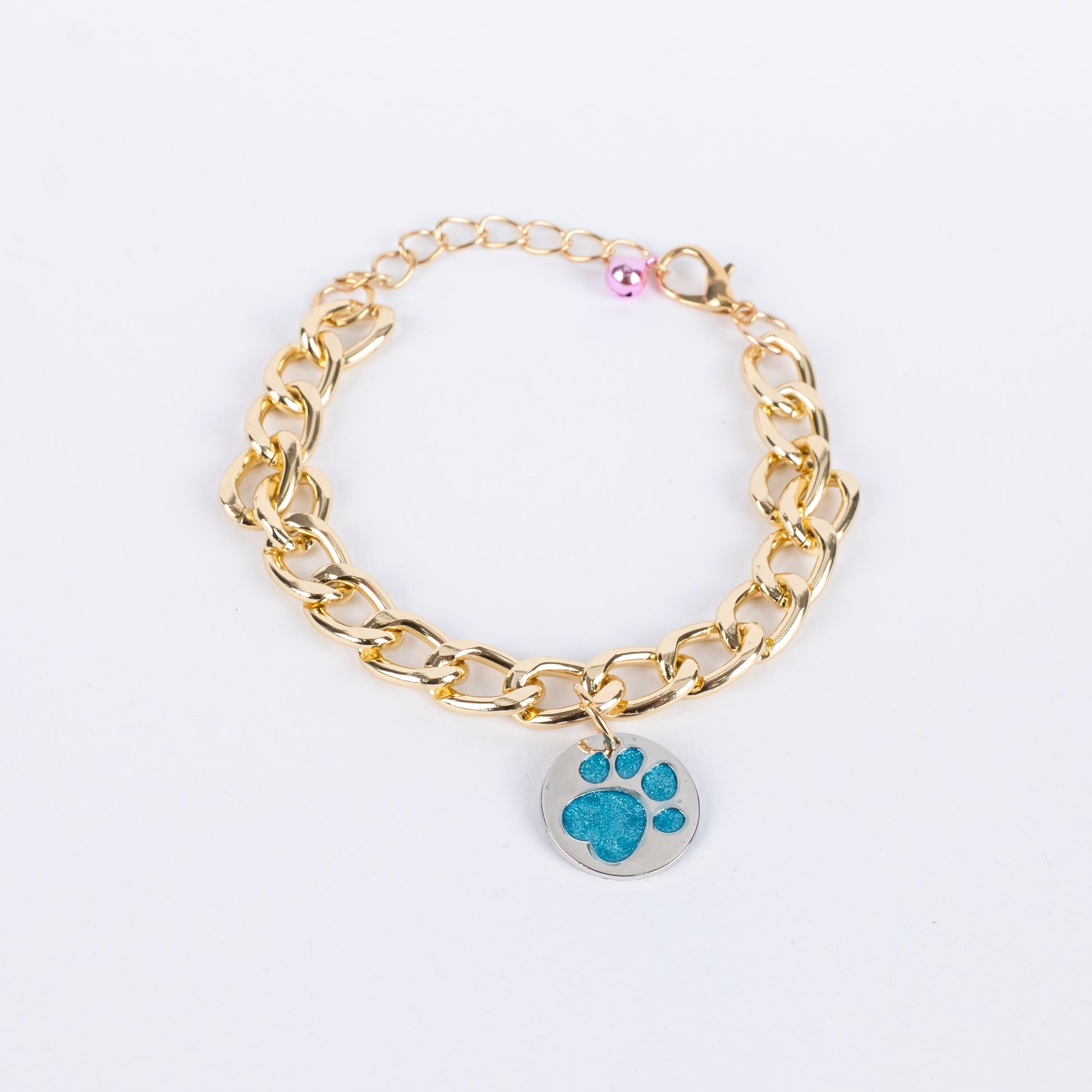 Collana per cani dal design raffinato, realizzata con maglie dorate resistenti e leggere per garantire comfort e stile. Arricchita da un ciondolo con impronta zampa glitterata color fucsia e da un piccolo campanellino coordinato, dona un tocco glamour e unico al tuo amico a quattro zampe.