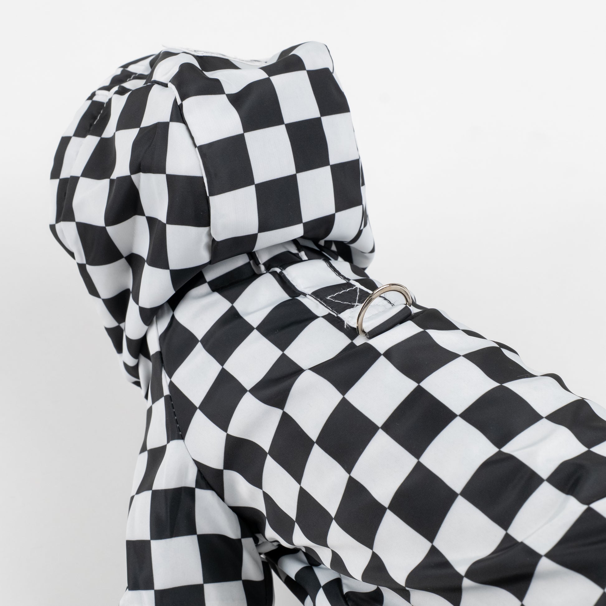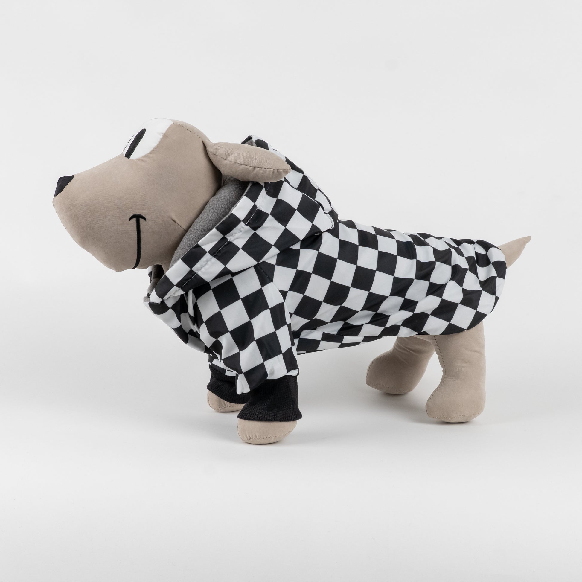 Affronta la pioggia con eleganza grazie al nostro impermeabile a fantasia a scacchi con cappuccio e interno in pile, pensato per offrire al tuo cane protezione, comfort e un look di tendenza.