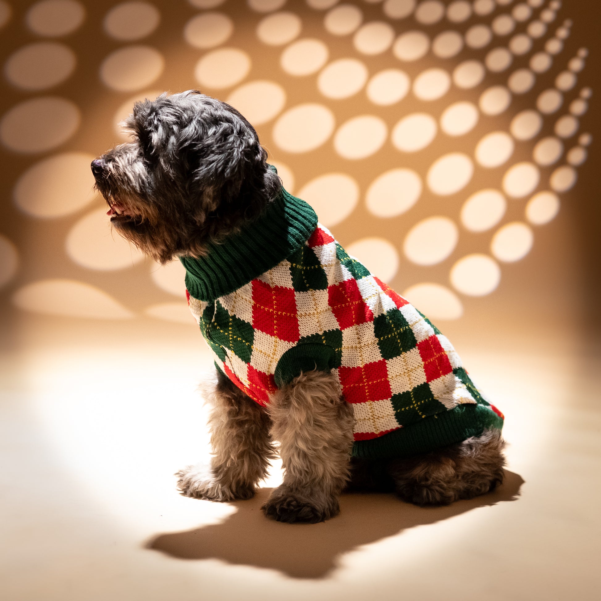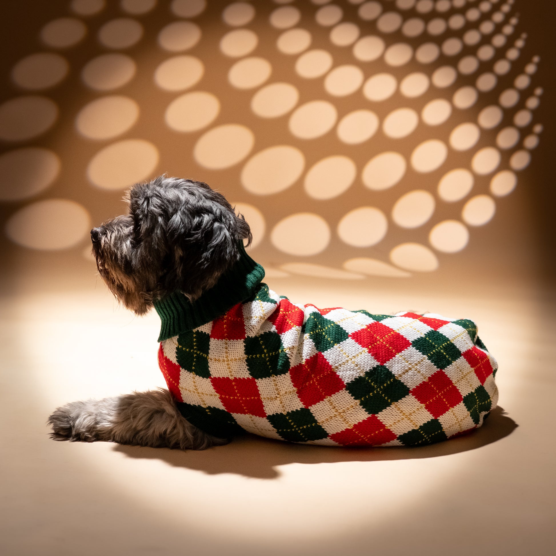 Il motivo a rombi dona un look elegante e allegro, rendendolo un capo versatile sia per le feste natalizie che per l’uso quotidiano. Il collo alto elasticizzato e gli orli lavorati assicurano un'aderenza confortevole, mentre le aperture ergonomiche per le zampette facilitano l’indossamento e garantiscono libertà di movimento.